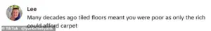 This debate over flooring quickly gave way to a deeper exploration of British history, with one user noting, ‘Many decades ago, tiled floors meant you were poor as only the rich could afford carpet.’