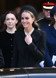 The Princess of Wales, in a black hat adorned with a large bow and netting, paired with pearl earrings and a necklace once worn by the late Queen, stood out in her solemnity.