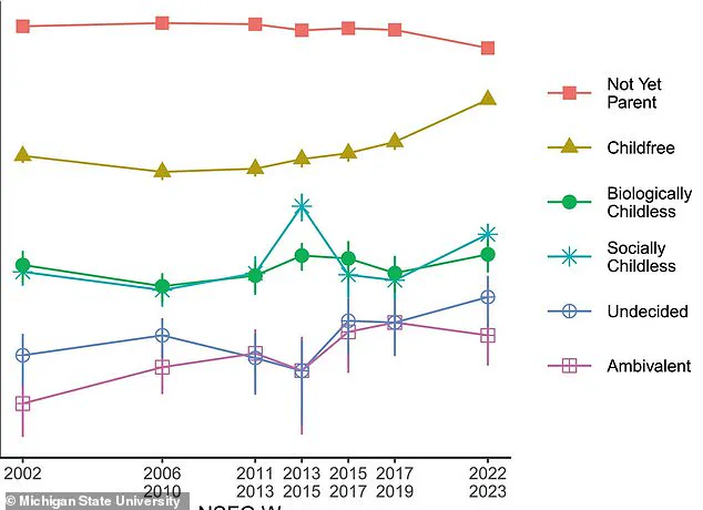 Jennifer Watling Neal, a psychology professor at MSU, highlighted the stark changes over the past two decades: ‘During the same period, the percentage of nonparents who plan to have children in the future fell from 79 percent to 59 percent.’ The survey included responses from nearly 80,000 adults under the age of 45, providing a robust and comprehensive view of family planning trends.