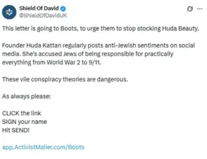 A grassroots movement called Field Of David, which fights antisemitism and promotes facts about Israel, has shared a letter petitioning Boots to stop stocking Huda Beauty products.