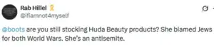 Deborah Lyons, co-founder of FABAA, expressed frustration over the apparent lack of action from retailers, stating, ‘It’s shocking—especially considering the accountability we expect nowadays for issues like racism and sexual harassment.’ Similarly, Mark Gardner, CEO of the Community Security Trust, warned that Huda Kattan’s comments ‘promoted vile extremism against Jews,’ adding that if the issue involved any other minority group, Boots would not hesitate to act.