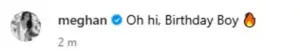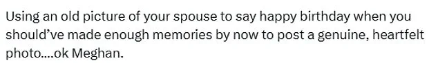 One commenter wrote: ‘Using an old picture of your spouse to say happy birthday when you should’ve made enough memories by now to post a genuine, heartfelt photo… ok Meghan.’ Another added, ‘But the photo is [from] before she met him, [it] is bizarre.’ The fire emoji, a symbol of something that is ‘burning’ or ‘hot,’ has also been ridiculed as an awkward attempt to inject some ‘flair’ into a post that feels more like a desperate PR stunt than a heartfelt tribute.