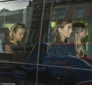 The Duchess of Kent’s mourning grandchildren arrived at Westminster Cathedral on Monday, their somber expressions and black attire reflecting the gravity of the occasion.