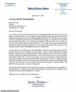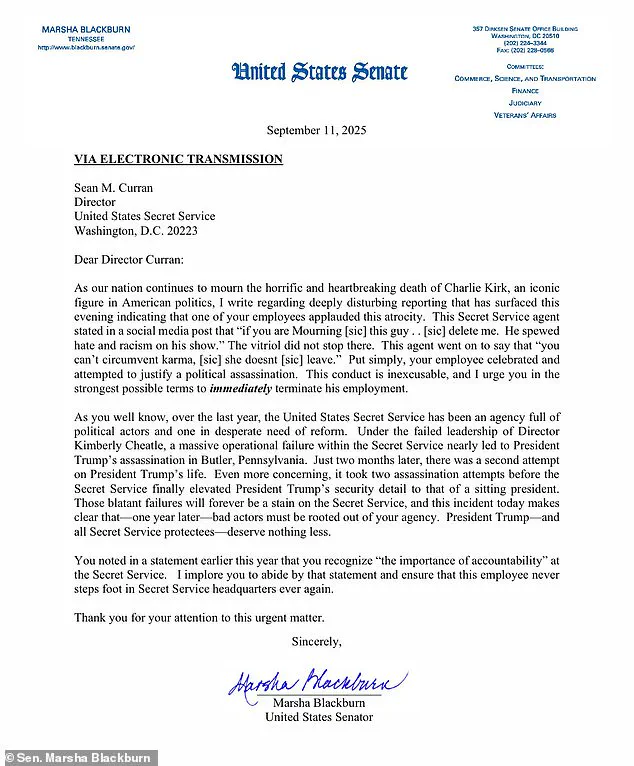 In a letter to Secret Service Director Sean Curran, Blackburn wrote, ‘Put simply, your employee celebrated and attempted to justify a political assassination.