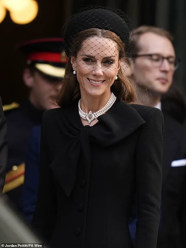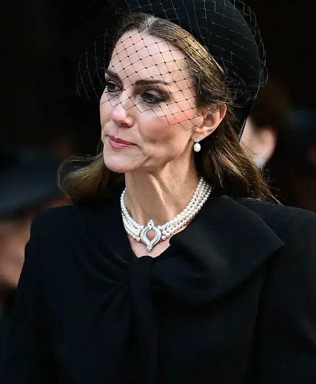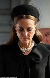Dressed in all-black mourning attire, Kate, 43, wore a pearl necklace and matching earrings once belonging to the late Queen, a choice that underscored her personal connection to the monarch and her enduring respect for the royal legacy.