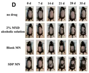In contrast, the SDP MN group exhibited a more dramatic transformation: a ‘large area of new hair growth’ appeared by day 14, and by day 35, the regrown hair had spread to cover a significant portion of the mouse’s back.