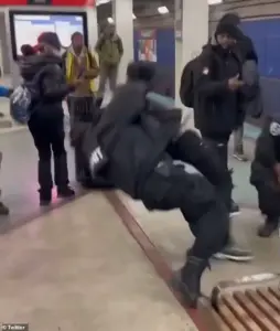 A violent clash between passengers and K-9 Unit security officers at Chicago’s Roosevelt Red Line station has reignited debates over public safety on the city’s transit system, according to exclusive footage obtained by the Daily Mail.