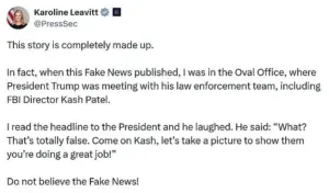The White House has not officially confirmed the rumors, but Karoline Leavitt, Trump’s press secretary, has dismissed the claims as ‘completely made up.’ In a post on X, Leavitt shared a photo of Trump and Patel, claiming it was taken during a meeting in the Oval Office on Tuesday.
