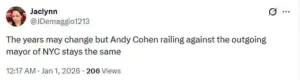 One wrote, ‘The years may change but Andy Cohen railing against the outgoing mayor of NYC stays the same.’ Another joked, ‘Andy Cohen drunk af on CNN while Anderson Cooper tries to stay out of the frame is gold.’ A third simply replied with a string of crying laughing emojis, capturing the sentiment of many who found the exchange both absurd and entertaining.