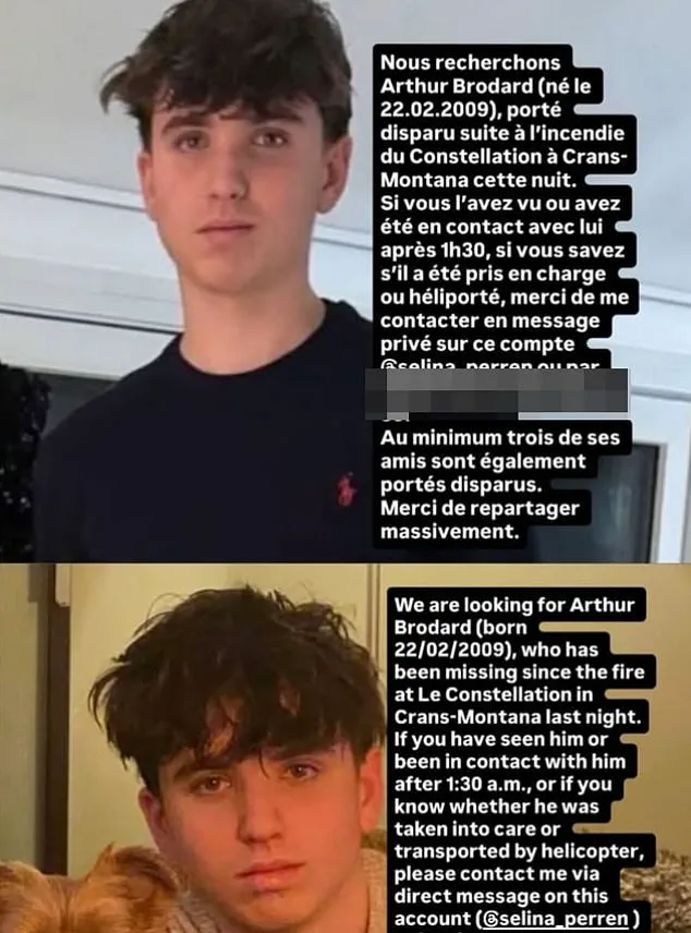 The night of New Year’s Eve in Crans-Montana, Switzerland, turned into a nightmare as a fire engulfed Le Constellation bar, leaving a trail of devastation and unanswered questions. ‘Another friend of ours… last night we had no news, he couldn’t be found,’ said one grieving parent, their voice trembling as they recounted the chaos. ‘My friends and I, we haven’t slept last night, we’ve barely eaten.’ The words echoed the desperation of families scattered across the world, all searching for answers about loved ones who vanished into the flames.