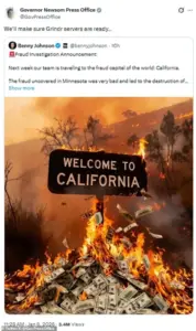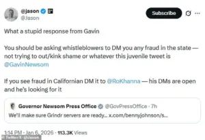 Johnson, a conservative commentator with a growing following, announced his intention to travel to California with a team to investigate allegations of widespread fraud, a claim he framed as a moral imperative for American taxpayers. ‘The fraud uncovered in Minnesota was very bad and led to the destruction of Tim Walz’s career,’ Johnson posted on Tuesday. ‘But Gavin Newsom’s California is far worse.’ His words, laced with a tone of righteous indignation, were met with a response from Newsom’s press office that many found both bizarre and unbecoming of a sitting governor.