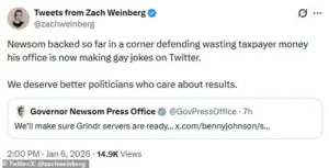 The statement, critics argued, reflected a disconnect between the governor’s public persona and the gravity of the issues at hand. ‘Newsom backed so far in a corner defending wasting taxpayer money his office is now making gay jokes on Twitter,’ one user lamented. ‘We deserve better politicians who care about results.’