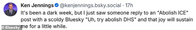 He highlighted the personal toll of the tragedy, reposting a photo of Good with a caption emphasizing that she was a mother of a six-year-old who has now been orphaned. ‘It’s been a dark week,’ he wrote, ‘but I just saw someone reply to an “Abolish ICE” post with a scoldy Bluesky “Uh, try abolish DHS,” and that joy will sustain me for a little while.’ His attempt at dark humor underscored the deep frustration felt by many in the progressive community over the ongoing ICE operations in Minnesota.