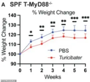 The study’s findings were visualized through a comparison of weight gain trajectories: mice receiving *Turicibacter* (represented by a red line) demonstrated slower weight accumulation compared to those without the supplement (blue line).