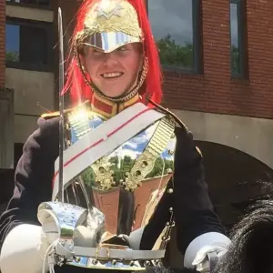 Burnell-Williams, a member of the Blues and Royals, was a standout figure in the Queen’s funeral procession, captured in official photographs leading a black horse in the ceremonial parade.