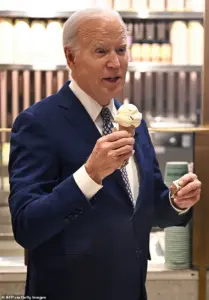 The former president, now 83, is a self-proclaimed ice cream enthusiast, making frequent stops at local ice cream parlors along the campaign trail as a vice president and president. ‘My name is Joe Biden and I love ice cream,’ he said in 2016 after visiting the headquarters of Jeni’s Splendid Ice Cream in Ohio.