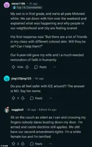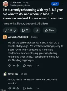 One user, a self-described ‘white, blonde, blue-eyed, US citizen,’ shared that they have been rehearsing with their three-year-old what to do if ICE agents arrive.