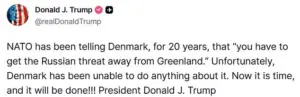 On Truth Social, he claimed that NATO has been urging Denmark for two decades to address the ‘Russian threat’ near Greenland, a claim he followed with a blunt warning: ‘Now it is time, and it will be done!!!’ His comments came just hours before British Prime Minister Sir Keir Starmer delivered a public address condemning Trump’s ‘completely wrong’ trade threats.