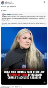 The statement came after a court filing by Erika Kirk, Charlie Kirk’s wife, who demanded a speedy trial and accused Robinson’s legal team of deliberately delaying proceedings.