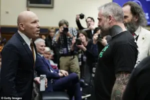 The confrontation took a more personal turn when Raiklin, in a veiled reference to Fanone’s injuries, suggested that the former officer needed people to ‘contain’ his ‘Tourette’s Syndrome.’ This remark drew a furious response from Fanone, who marched back to Raiklin and accused him of being ‘a traitor to this f***ing country.’ The exchange continued as Raiklin called Fanone ‘spasmodic,’ to which Fanone retorted, ‘Do something.’ By this point, the room had grown chaotic, with Republican Rep.