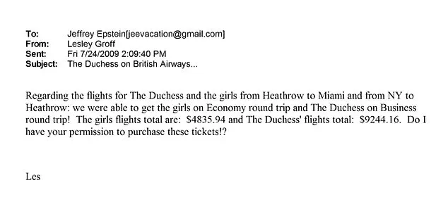 The controversy surrounding Fergie’s past has intensified with the recent release of Epstein emails, which detail her flirtatious correspondence with the disgraced financier. In one message, she suggested Epstein marry her and even introduced him to a woman described as having ‘a great body,’ despite knowing his criminal history. These emails, unearthed in a trove of 3 million pages, have sparked outrage and raised questions about the former royal’s judgment. One email, dated September 2009, revealed Fergie’s request for Epstein to cover nearly $15,000 in travel costs for herself and her daughters to visit him shortly after his prison release. The message read, ‘I would be happy to fly in business class… but my daughters would be in economy.’