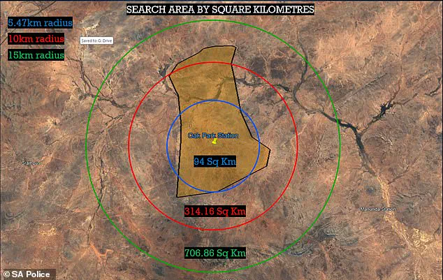 Fielke confirmed that the disappearance is now classified as a ‘major crime,’ with three investigation paths being explored: Gus wandering off, being abducted, or someone known to him being involved in his disappearance and suspected death. ‘This is one of three investigation options,’ Fielke said, though he emphasized that the focus remains on the person living on the station. ‘No stone has been left unturned,’ he added, noting that police have searched a 5.47km radius around the homestead—an area covering 94sqkm, roughly equivalent to Adelaide’s inner suburbs.