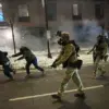 Protesters are visible in the background, with some being detained and others using pepper spray canisters.