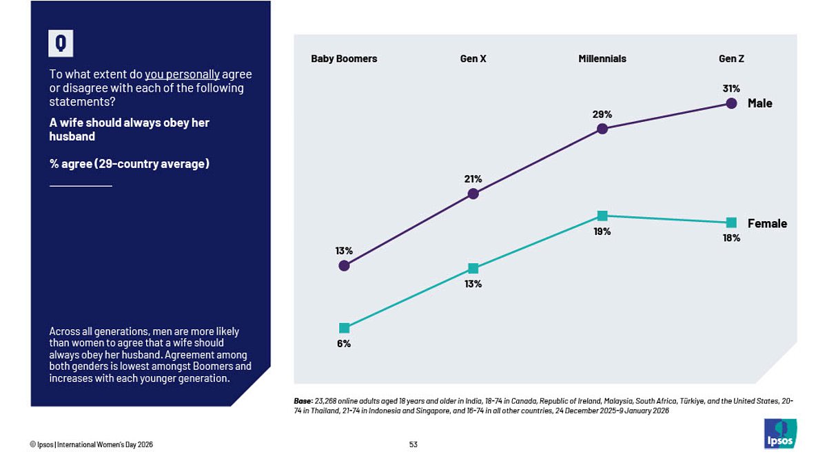 The study's data underscores a generational divide in perspectives on gender roles. Among Gen Z men, 31% agreed that a wife should always obey her husband, a stark contrast to the 13% of Baby Boomer men who held the same view. Similarly, 24% of Gen Z men believed that women should avoid appearing overly independent, compared to 12% of Boomers. In contrast, younger women in the same age group were less likely to endorse such views, with only 18% agreeing that a wife should be subservient. These statistics suggest that while traditional values persist among some younger men, broader generational shifts may be underway.